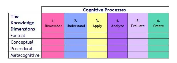 According to Anderson, et al. (2001), there are four dimensions of knowledge: factual, conceptual, procedural, and metacognitive. There are also six domains of knowledge: remembering, understanding, applying, analyzing, evaluating, and creating. The relationship among the dimensions of knowledge and the domains of knowledge form a matrix and taxonomy from which learning objectives can be derived. Please click on the link below (Dr. Wilson) for a detailed explanation of how we use the theory. In the following paragraphs are brief descriptions of some of the other learning theories we employ in designing our courses of study.